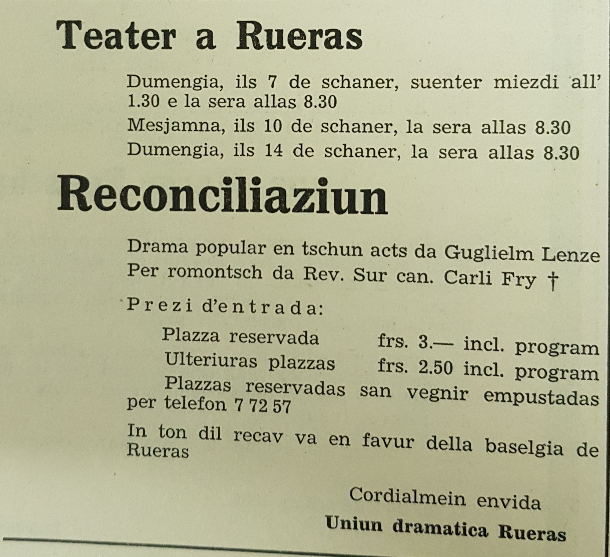 Suenter che l’uniun dramatica da Rueras ha dau onn il drama religius «Nossadunna da Fatima», ha ella elegiu uonn in toc da tutt’autra tempra: il drama popular «Reconciliaziun». Era quei toc ei translataus ed arranschaus per nossas relaziuns da reverendissim sur canoni Carli Fry p.m.. Sche in um da lavur stendida sco il nunemblideivel sur Fry prendeva temps e peda da translatar in teater, lu astg’ins bein supponer ch’el elegeva buca tocs mo ual aschia. Per gliez fuva el memia perschuadius dalla missiun dil teater, ch’el sez descriva cun ils plaids: «La missiun dil teater romontsch ei adina stada, sper il porscher recreaziun e deletg, instruir ed edificar».