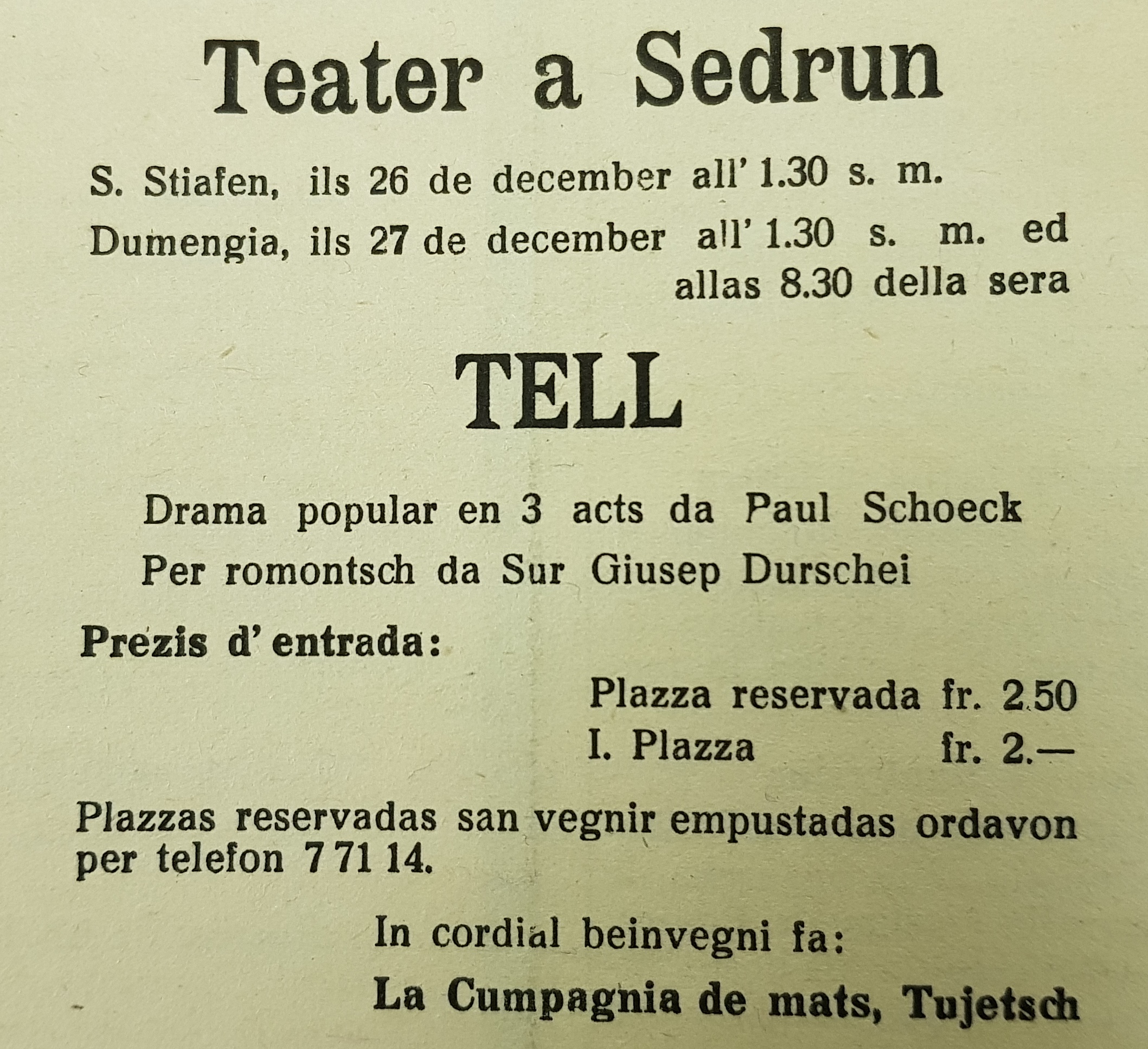 Il Tell da Paul Schöck ei senz’auter in’ovra dramatica bein gartegiada, sempla e mudesta en sia construcziun e dimensiun. – Ils fatgs pesonts historics che succedan per las cuntradas giu sper il lag dallas treis tiarettas s’entaupan tuts en ina bufatga stivetta purila. La sligiaziun tecnica ei aschia ordvart leva e perquei tuttavia beinvegnida en nossas relaziuns. – Il pievel giu sper il lag cun sias veglias schlattas burgheisas ei en siu sentir entir entratg parents cun nus auters. Nus capin fetg e bein siu patratg e siu agir e quitein beinduras da stuer cargar viaden en lur fatgs e gidar atras il spessom selvadi da lur veta luvrera sils splems dalla glisch, la dumengia da lur patratg patriotic … O, igl ei ver ch’ils fiugs che han ars lezzas uras per cullinas e sumfils han è stendiu lur bratscha sur ils precipezis giu en las valladas dalla Rezia e fatg tschessar silmeins ruc a ruc ils grevs tscheins-fier da signuria feudala.